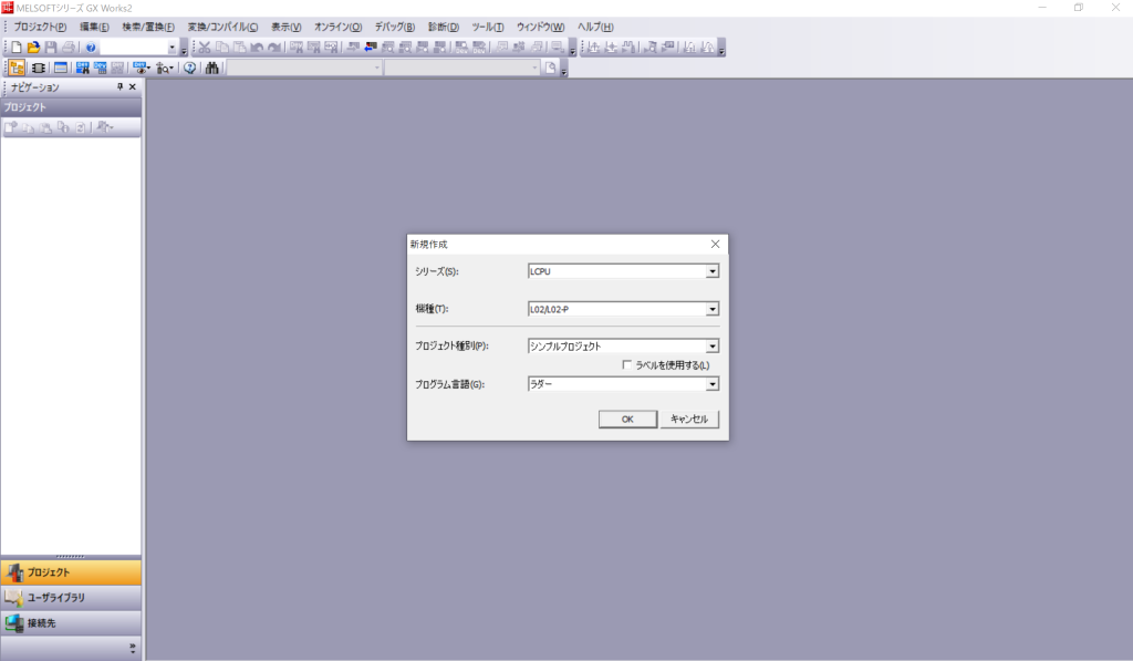 GX Works2 のメニューの [プロジェクト] – [新規作成] からお使いの CPU ユニットを選択してプロジェクトを新規作成します。