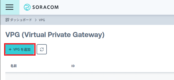 SORACOM ユーザーコンソールにログインし、 [メニュー] – [VPG] で VPG 管理画面を表示、 [+ VPG を追加] ボタンをクリックします。
