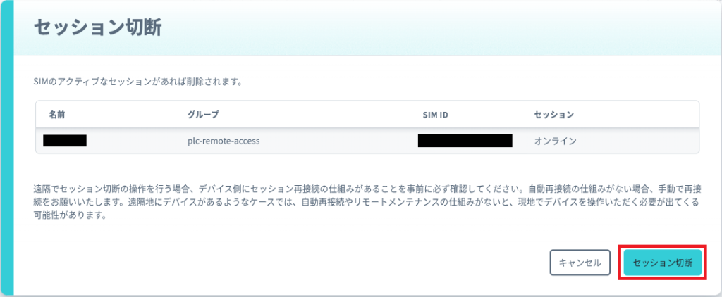 VPG に接続するため、 SIM 管理画面で LTE ルーターにセットしている SIM にチェックを入れ、[操作] – [セッション切断] を選択、 [セッション切断] ボタンをクリックします。