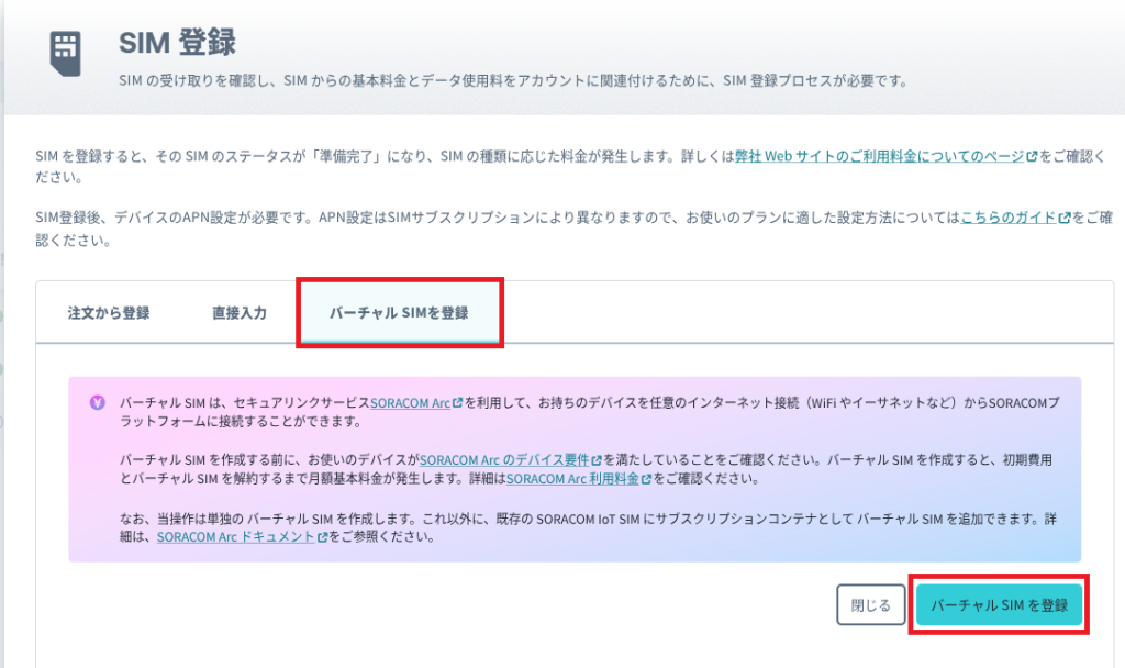 SIM 管理画面の [+ SIM 登録] ボタンをクリックし SIM 登録ダイアログを表示、画面中央の [バーチャル SIM を登録] タブに切り替えて [登録] ボタンをクリックします。