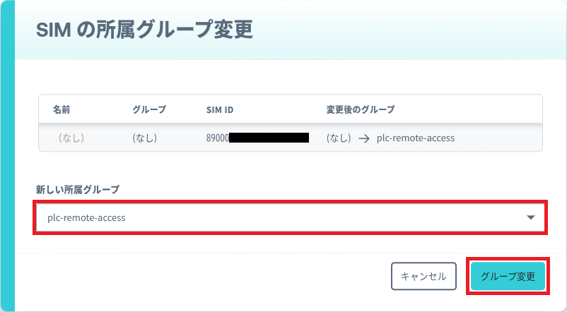 次に、 IoT SIM を SIM グループに設定します。 [メニュー] – [SIM 管理] で SIM 管理画面を表示し、 LTE ルーターにセットしている SIM にチェックを入れ、 [操作] – [所属グループを変更] を選択します。 [新しい所属グループ] のドロップダウンから作成した SIM グループ [plc-remote-access] を選択し、 [グループ変更] ボタンをクリックします。