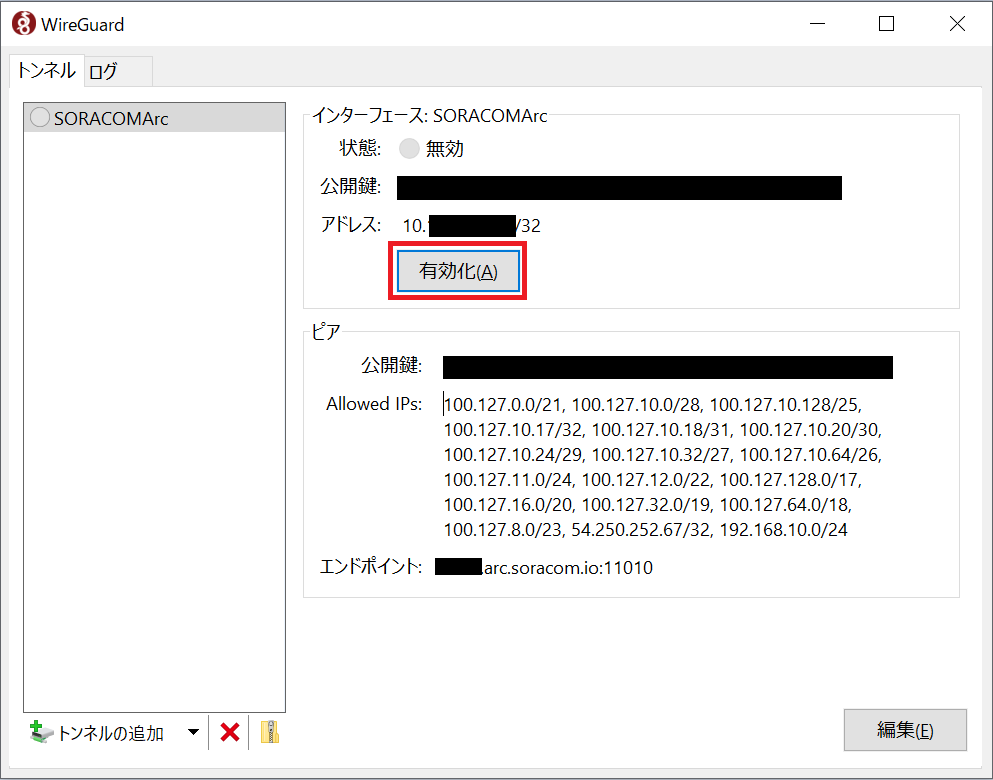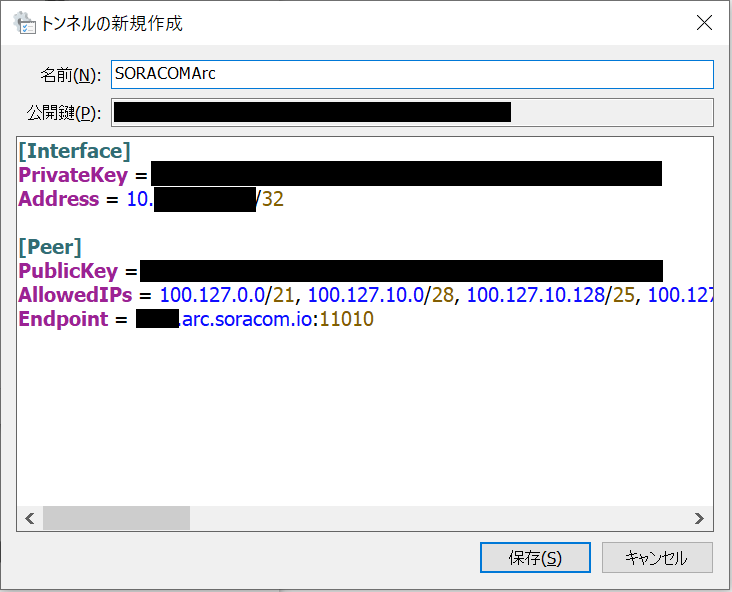 [Interface] PrivateKey = XXXXXXXXXXXXXXXXXXXXXXXXXXXXXXXXXXX Address = 10.XX.XX.XX/32 [Peer] PublicKey = XXXXXXXXXXXXXXXXXXXXXXXXXXXXXXXXXXX AllowedIPs = 100.xx.xx.xx/xx,(中略), 192.168.10.0/24 Endpoint = xxx.arc.soracom.io:11010
