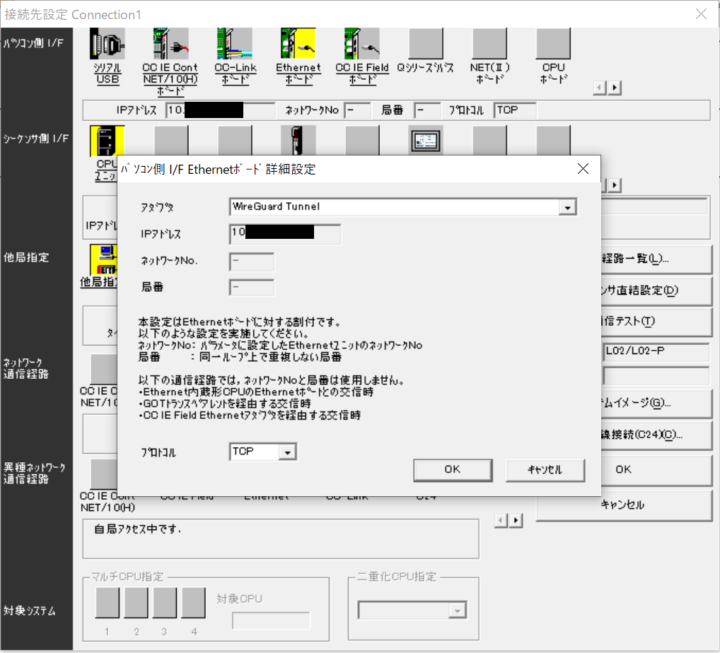 ここでは、遠隔からのリモートアクセスに利用するパソコンに WireGuard を設定し、 GX Works2 から PLC の Ethernet ポートに接続します。