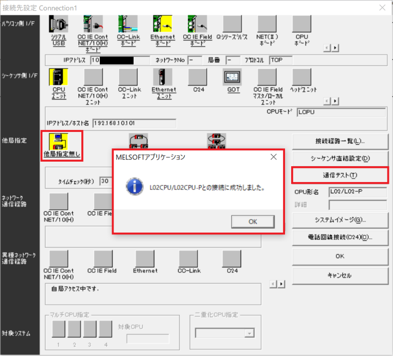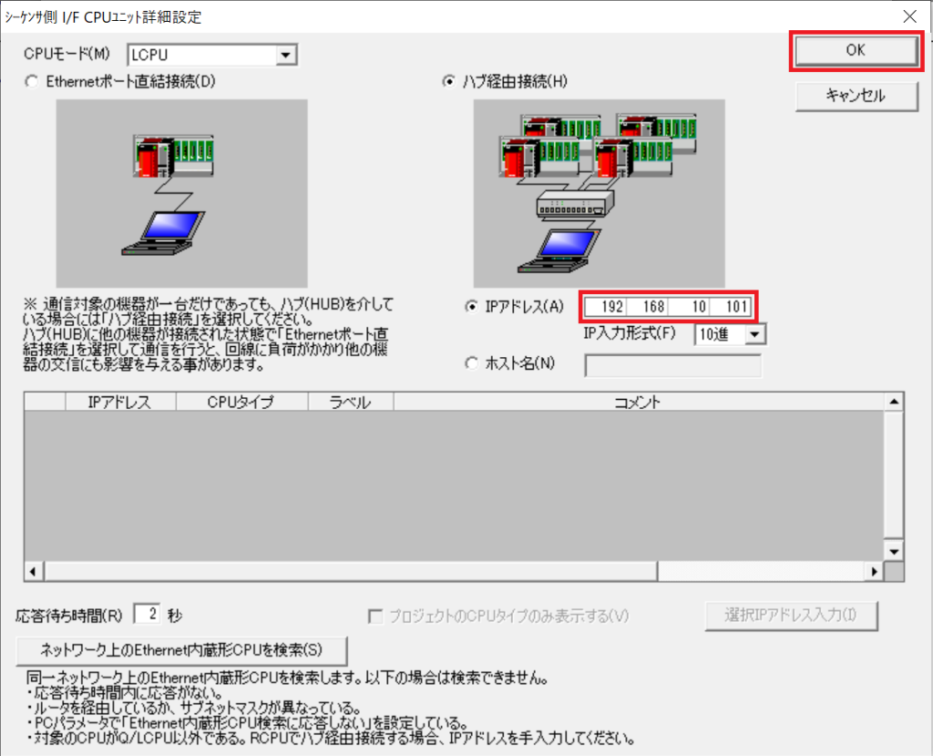 続いて [シーケンサ側 I/F] – [CPUユニット] ダブルクリックし設定画面を開きます。[ハブ経由接続] を選択し、 [IPアドレス] に PLC の IP アドレスである「192.168.10.101」を入力します。