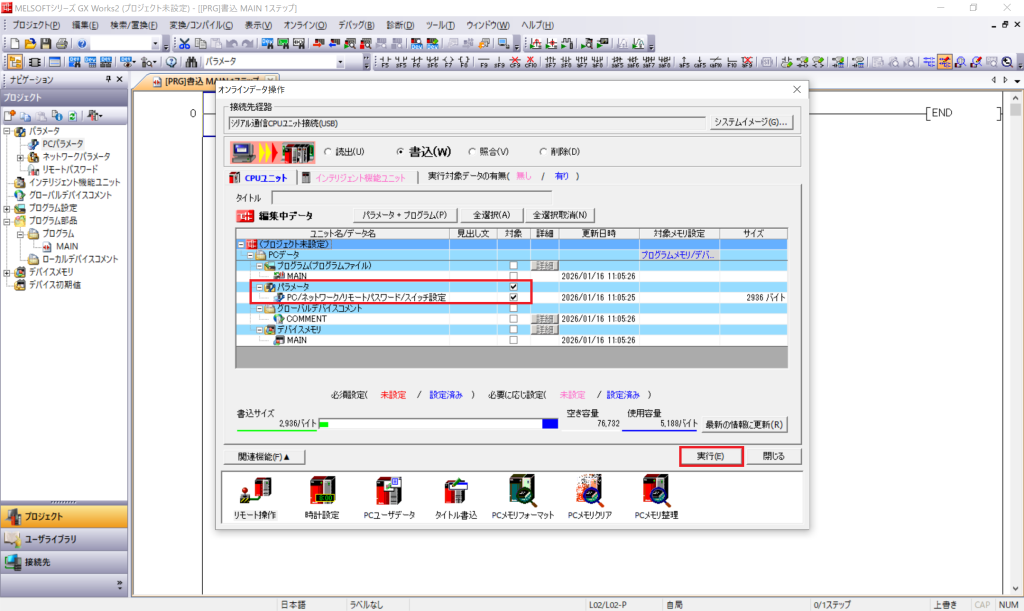 メニューから [オンライン] – [PC書込] を選択し、PLCへの設定書き込みを行います。