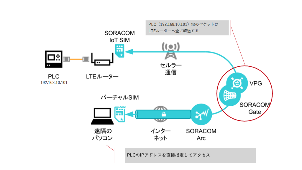 VPG Type-F の SIM ベースルーティングでは、遠隔地のパソコンから直接LTEルーター配下のPLCのIPアドレスを指定することができます。