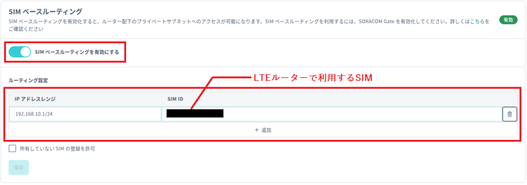 ルーティング設定後、[SIMベースルーティングを有効にする]のスイッチを[ON]に切り替えて、[保存]ボタンをクリックします。